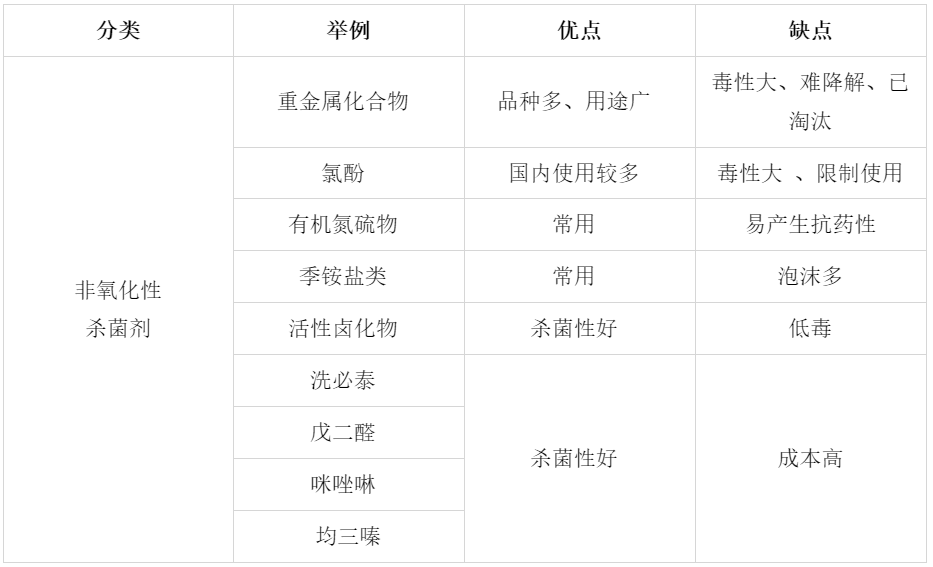 2、非氧化性殺菌劑種類及優(yōu)缺點(diǎn):