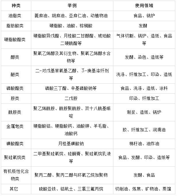 需要特別說(shuō)明的是,同時(shí)具備上述十余種特性的消泡劑是不存在的,一種消泡劑只能對(duì)特定一種或幾種體系起作用。各種消泡劑及使用領(lǐng)域,詳見(jiàn)下圖→