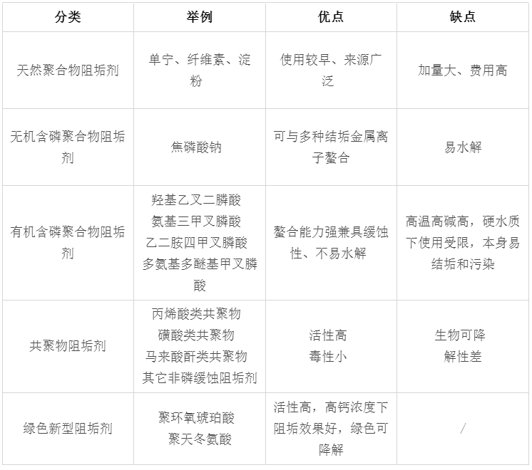 1、天然聚合物阻垢劑;2、含磷聚合物阻垢劑;3、共聚物阻垢劑;4、綠色新型阻垢劑。其種類、舉例及優(yōu)缺點(diǎn)說(shuō)明,如下圖所示→、